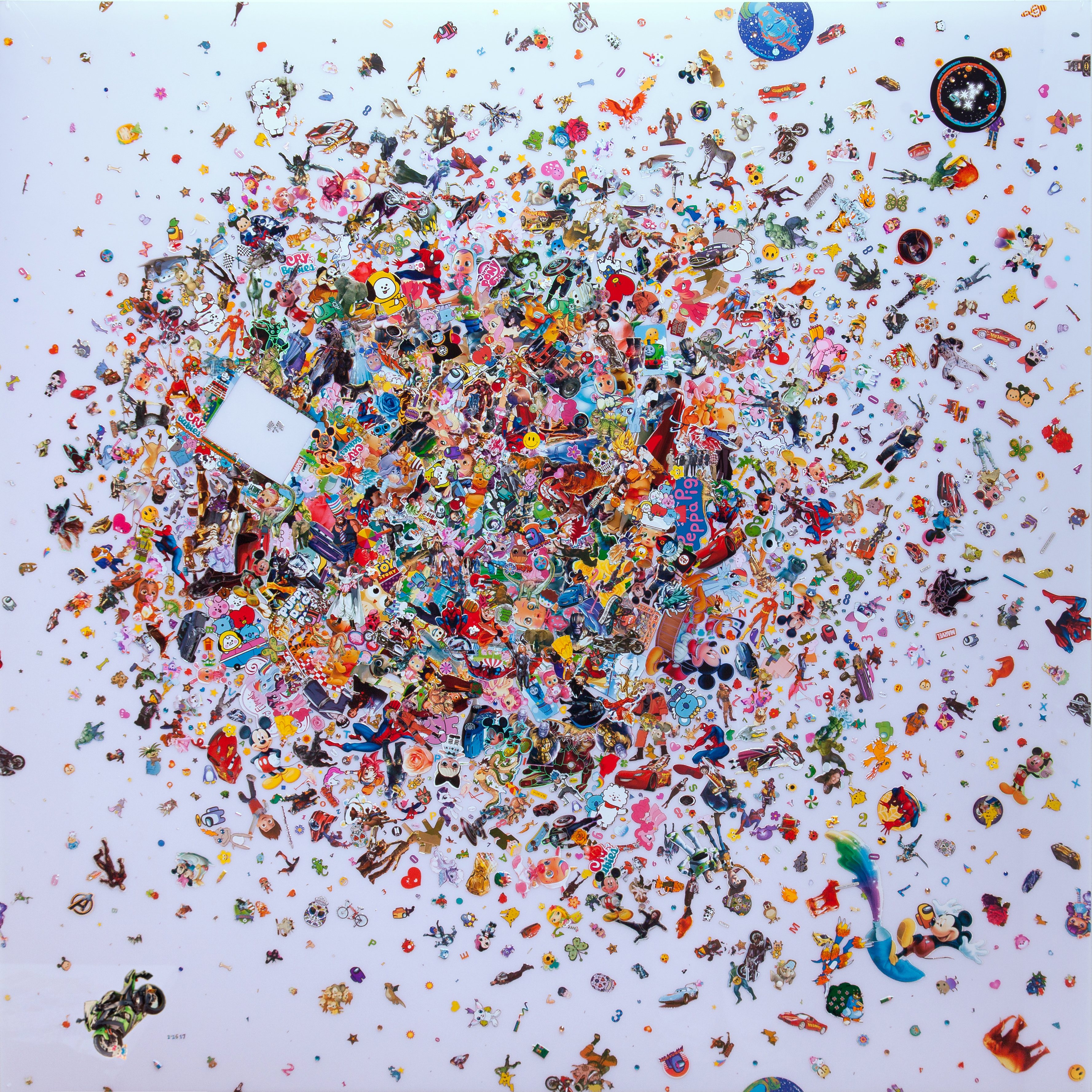 Pondremos retenciones cero a las exportaciones de colisionadores de hadrones, 2022. Stickers sobre placa de policarbonato de alta densidad. 1220 x 1220 x 3 mm. Isidro Gamarra.