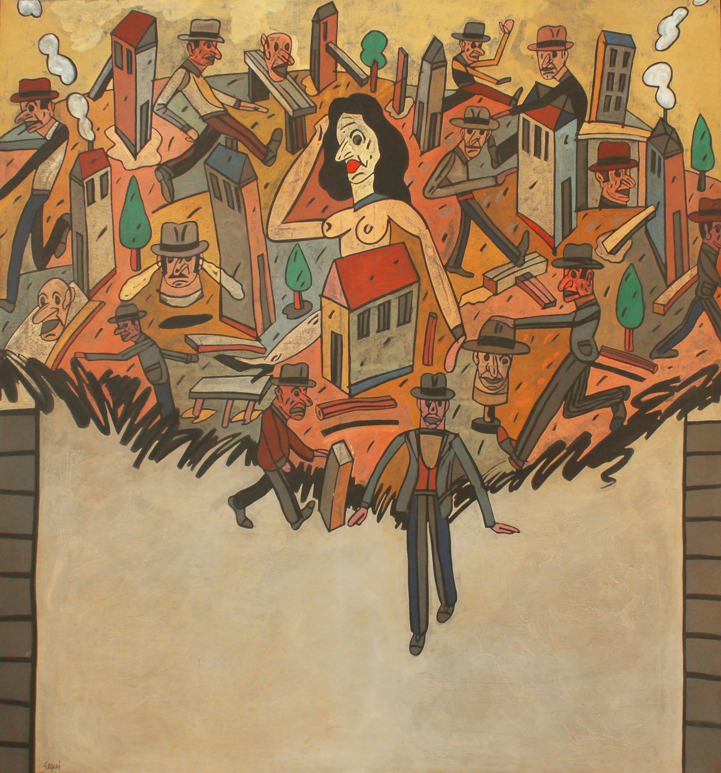 Antonio Seguí (Córdoba,1934 – BuenosAires, 2022) Pintor, escultor e ilustrador argentino de gran presencia internacional, residió desde 1963 en París, siendo uno de los artistas argentinos más emblemáticos. Reaizó exhibiciones en instituciones de distintas partes del mundo sin perder la vinculación con la cultura local. Sus temáticas son inconfundiblemente argentinas, con una perspectiva crítica de la sociedad, utilizando la retórica de la ironía y el humor. Aunque la figuración caracterizó la obra desde sus inicios, durante 1958 y 1962 concretó composiciones abstractas formando parte de la emergencia del Informalismo en Argentina y constituyendo el emblemático grupo Arte destructivo. Trabajó en series narrativas y críticas compuestas por cuadros poblados de hombrecitos con sus característicos sombreros vestidos a la usanza de los años veinte, de elefantes que transitan por la pampa, de perros amenazantes y de hombres que miran detrás de un muro, personajes grotescos dentro de un encuadre urbano. Durante algún tiempo utilizó recursos propios de la historieta, textos, flechas o señales diversas yuxtapuestas a las figuras que remiten al lenguaje del comic, y los elementos plásticos vinculados al graffiti. Representó a la Argentina en la XXXII Biennale di Venezia de 1964, la XLI Biennale di Venezia en 1984, y la XXV Bienal de São Paulo en 1987. Obtuvo varios reconocimientos, entre ellos: Premio Bibliofilia, Office de Promotion de I’Edition Francaise, París (1978); Medalla de Honor de la VIII Bienal de Grabado, Cracovia (1980); Premio VII Bienal de San Juan, Puerto Rico (1986); Premio Di Tella, Buenos Aires (1989); Gran Premio Fondo Nacional de las Artes, Buenos Aires (1990); Premio Konex de Platino, Buenos Aires, Argentina (2002); Officier dans l’Ordre des Arts et des Lettres, París (2008). Entre sus muestras retrospectivas se destacan las realizadas en el Museo Nacional de Bellas Artes, Buenos Aires (1991), Museo Georges Pompidou, Paris (2005), Museo de Arte Moderno de Buenos Aires – MAMBA (2011). Su obra forma parte de las más importantes colecciones nacionales e internacionales tales como: Museum of Modern Art – MoMA, Nueva York; Solomon R. Guggenheim Museum, Nueva York; Hirshhorn Museum and Sculpture Garden, Washington D.C.; Musée des Beaux- Arts, Lyon; Centre National des Arts Plastiques; Fonds National d’Art Contemporain, París; Musée National d’Art Moderne, París; Centre Georges, Museo de Arte Moderno, Río de Janeiro; Museo de Arte Contemporâneo, São Paulo; Museo de Arte Moderno La Tertulia, Cali; Casa de la Cultura, Quito; Museo de Bellas Artes, Caracas; Museo de Arte Latinoamericano de Buenos Aires- MALBA; Museo de Arte Moderno – MAMBA, Buenos Aires; Museo Nacional de Bellas Artes – MNBA, Buenos Aires; Museo Castagnino+Macro, Rosario.