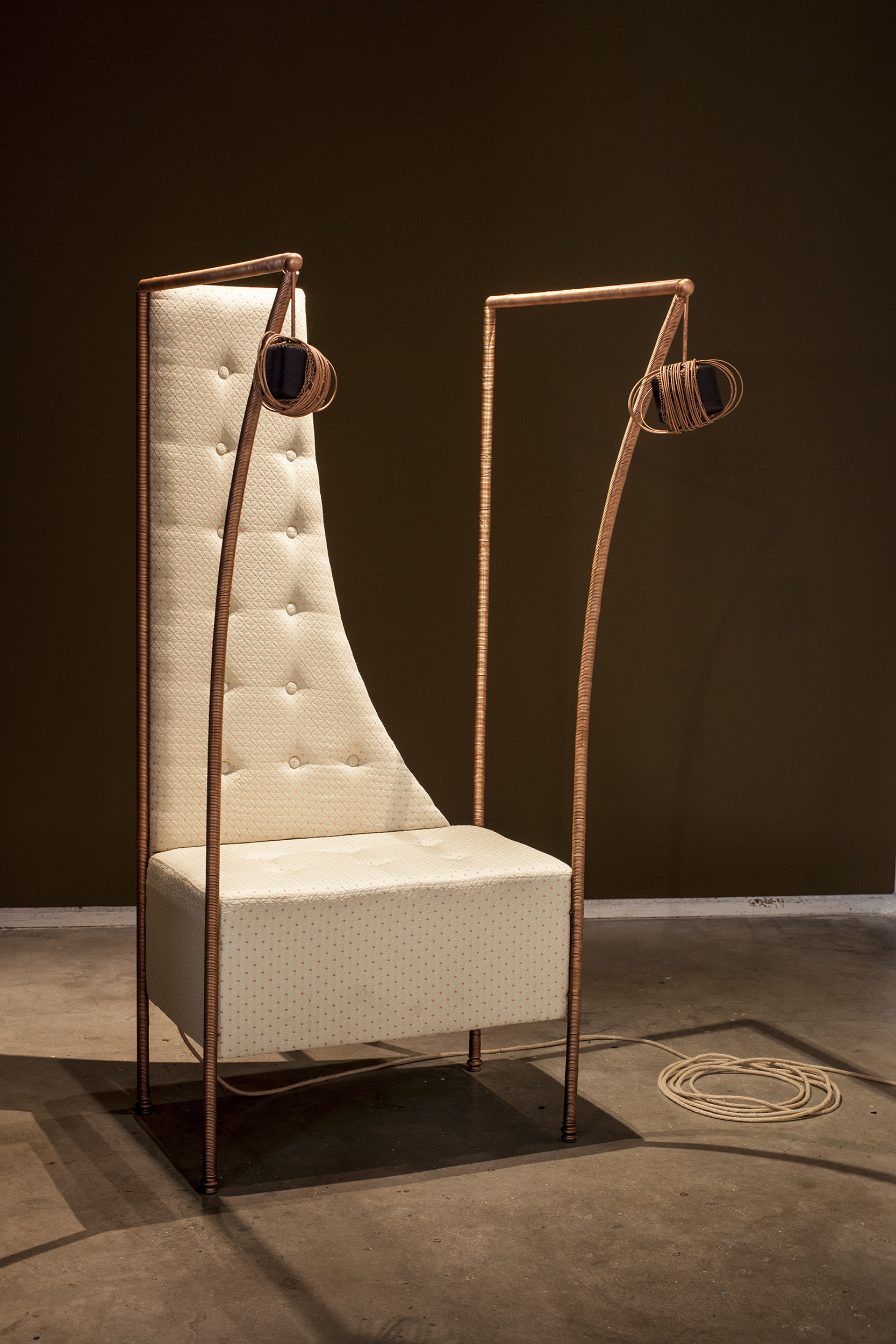 Tempranas reflexiones de una cuerda, 2021. Sound object Duration of the sound piece 3' 5'' (loop) Iron, wire, enamel, piano wire upholstered osb, 2.1 Bose Acoustimass speaker system amplified with class AB power, portable player, 2-stage proximity automation system with Arduino modules. 170 x 91 x 90 cm. Photo credit: Ivana Salfity