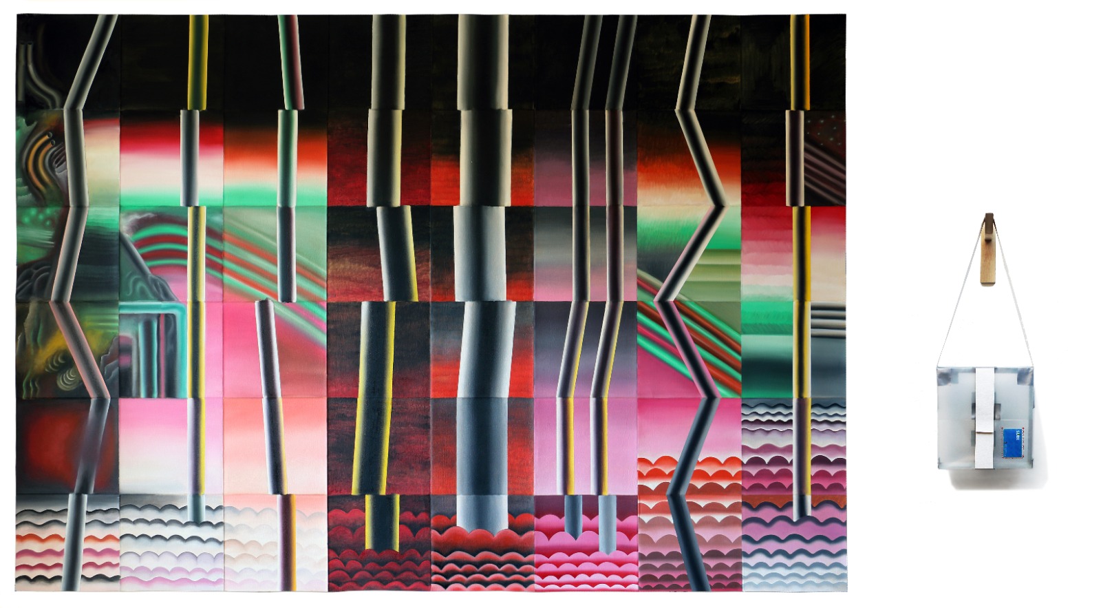 Santiago Poggio’s paintings confront us, like profane and contemporary representations of full-page illuminations from medieval manuscripts, with images lacking the textual framework that supports them. This is how we may find ourselves tempted to use our own reservoir of images, our accumulation of skills and expectations to interpret his representations (narrations perhaps?) or simply become ensnared in the fantasy world he offers, demanding that we pause time and immerse ourselves in them. So, where does the appeal of his paintings lie? Is it in understanding their meaning or, perhaps, in their capacity to serve as receptacles for our own projections? Themes, images, and readings from various origins are summoned in his works, not as direct references or citations – sometimes not even intended as such – but as part of Poggio’s own cultural baggage. Moving freely between real and fantastical representations, plausible and imaginary, he creates within the sway of geometric abstraction and hyper-narrative imagery. His works constitute a deformed and disturbed interiority that contrasts with – and at the same time, filters through – the rigid environment of non-narrative geometric structures. Taking painting as a starting point, he explores ways to construct a narrative, turning the pictorial device into a tool for reflecting on the world, unfolding philosophical ideas, and creating thought. And while painting is his focus, from time to time, his universes expand, thirsting for new media to manifest themselves, in sculpture, objects, drawing, performance, and installations.
